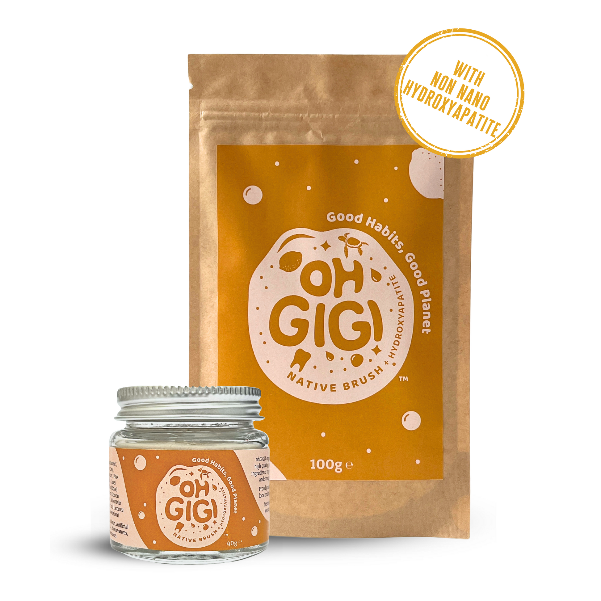 Kick off your new habit with an ohGiGi Hydroxyapatite Tooth Powder jar and a bulk refill pack ready to top up your glass jar two and a half times over!