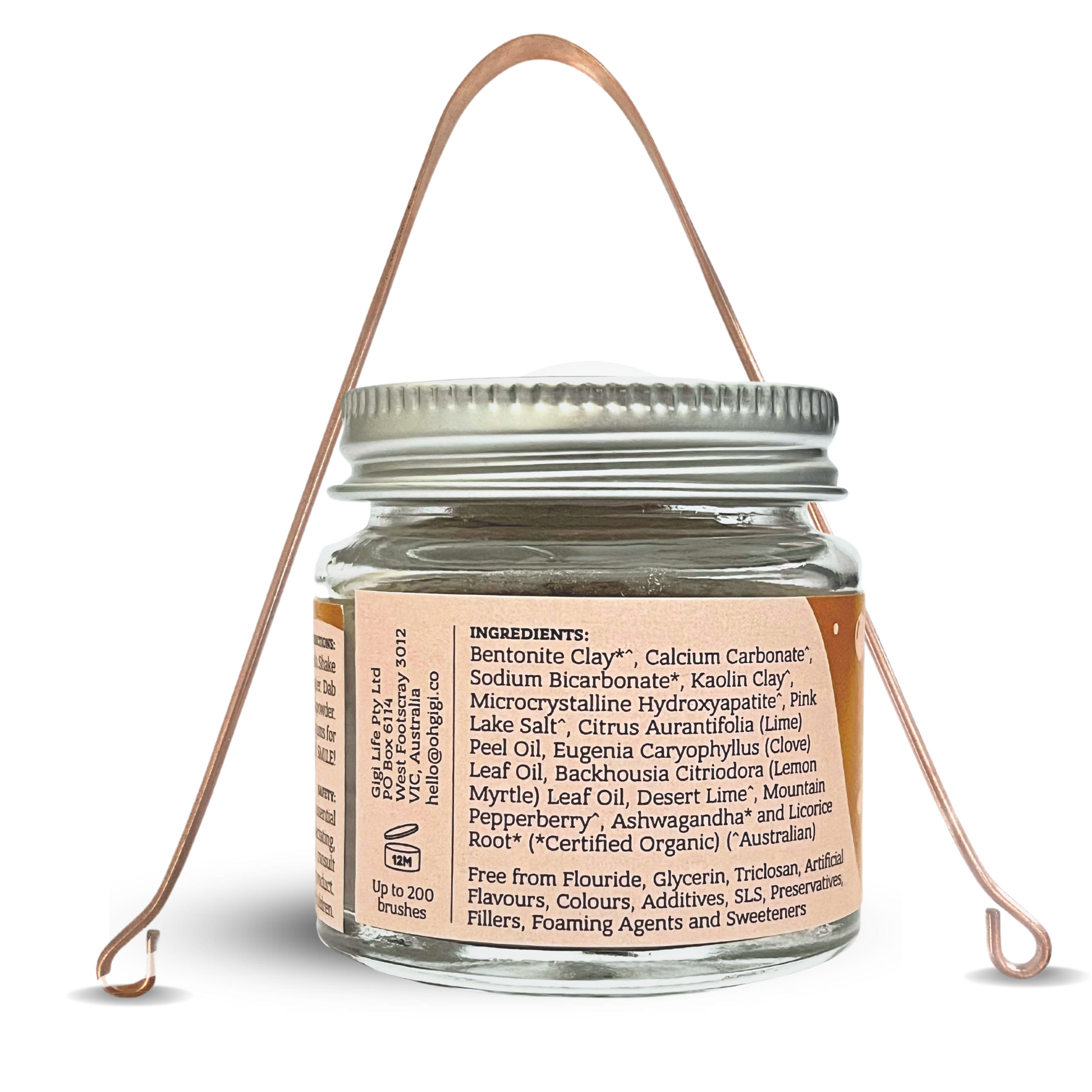 Perfectly flavoured with the right balance of organic Lime, Clove and Lemon Mrytle essential oils, with Australian natives Desert Lime and Mountain Pepperberry for a zesty and spicy flavour to your toothpowder whilst celebrating the power of indigenous superfoods.