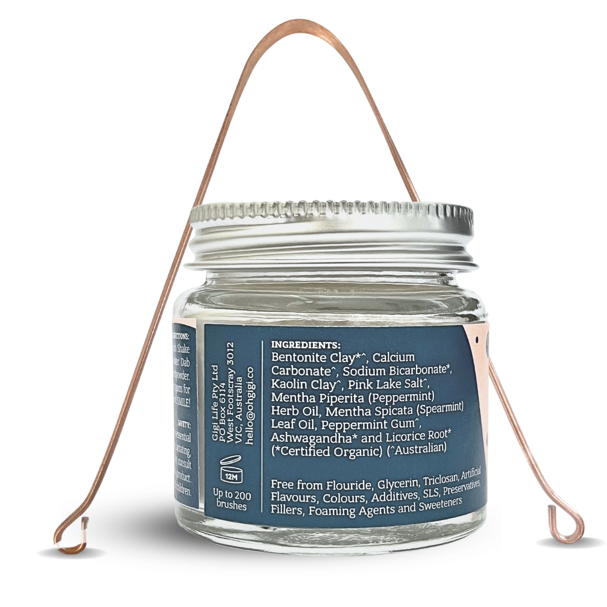 Bentonite Clay*^, Calcium Carbonate^, Sodium Bicarbonate*, Kaolin Clay^, Pink Lake Salt^, Mentha Piperita (Peppermint) Herb Oil, Mentha Spicata (Spearmint) Leaf Oil, Peppermint Gum^, Ashwagandha* & Licorice Root*